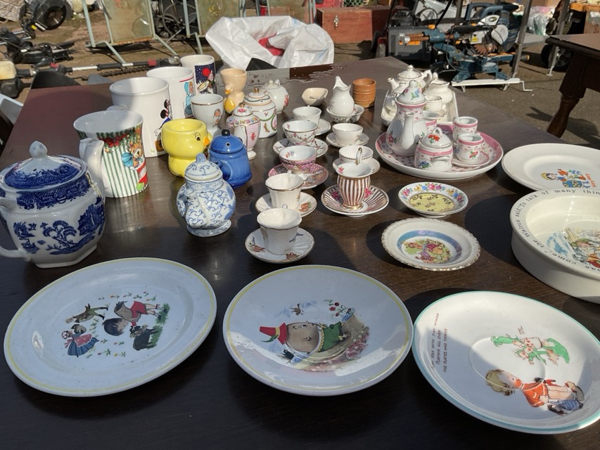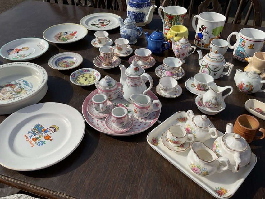 A collection of childrens ceramics - teaplates, saucers, mugs, eggcups, a baby plate, miniature cups & saucers, teapots, dolls tea and coffee sets on trays, a salt glazed tankard, etc. (A lot)