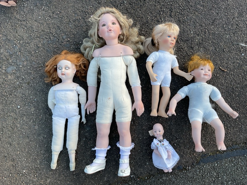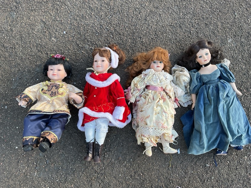 Nine modern porcelain head dolls - three dressed in Victorian style, a Chinese girl by Leonardo, boys and girls, a reproduction Victorian example with sleep eyes and cloth body, a baby doll, and a 25in cloth bodied girl. (9)