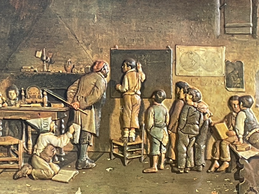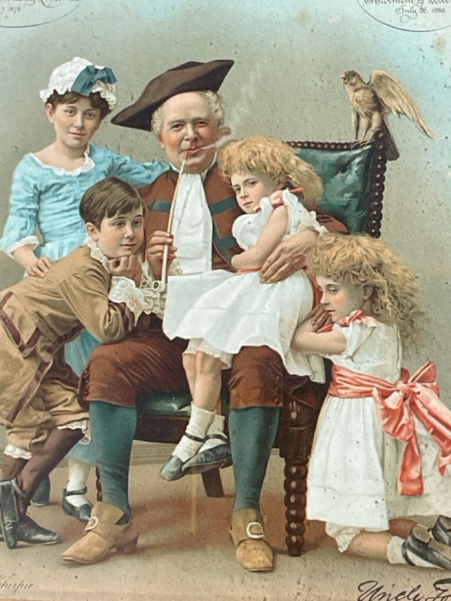 A Victorian 1886 Newcastle Weekly Chronicle Dicky Bird Society chromolithograph depicting Uncle Toby surrounded by children in a period oak frame; and an Edwardian relief embossed print of a country schoolroom, in a period mahogany frame. (2)