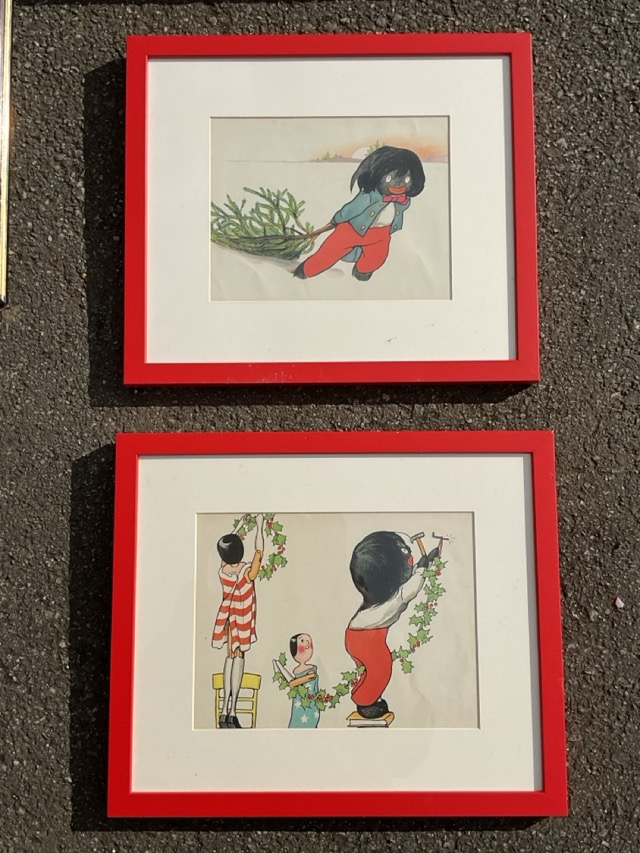 Coloured prints - a pair of Edwardian Florence Upton golly Christmas subjects, an Alfred Bestall Rupert the Bear winter scene, a reproduction Pears Soap poster, and a childrens alphabet rhyme poster, all framed. (5)