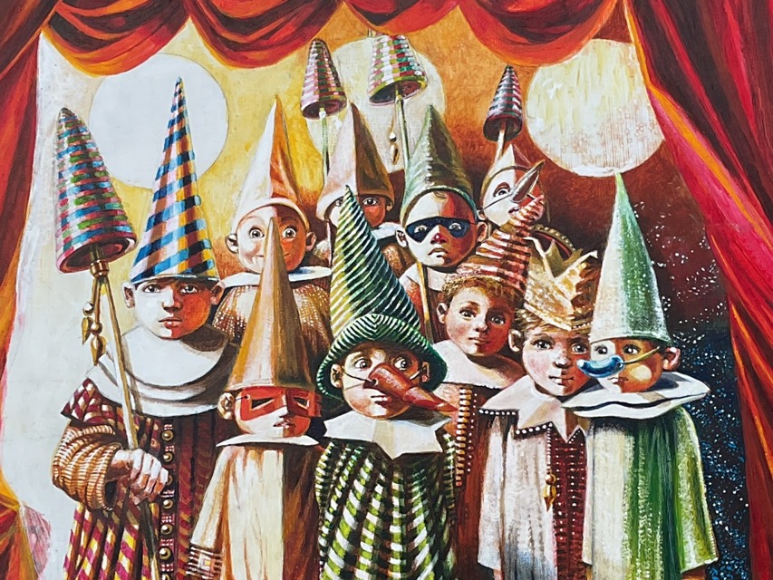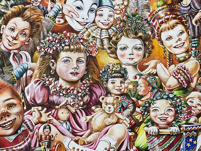Manuella Norris, oils on board, toys, dolls, puppets and masks; another with children dressed as pierrots on a stage; and an oil on canvas cover of a 1913 dolls & toys Christmas catalogue. (3)