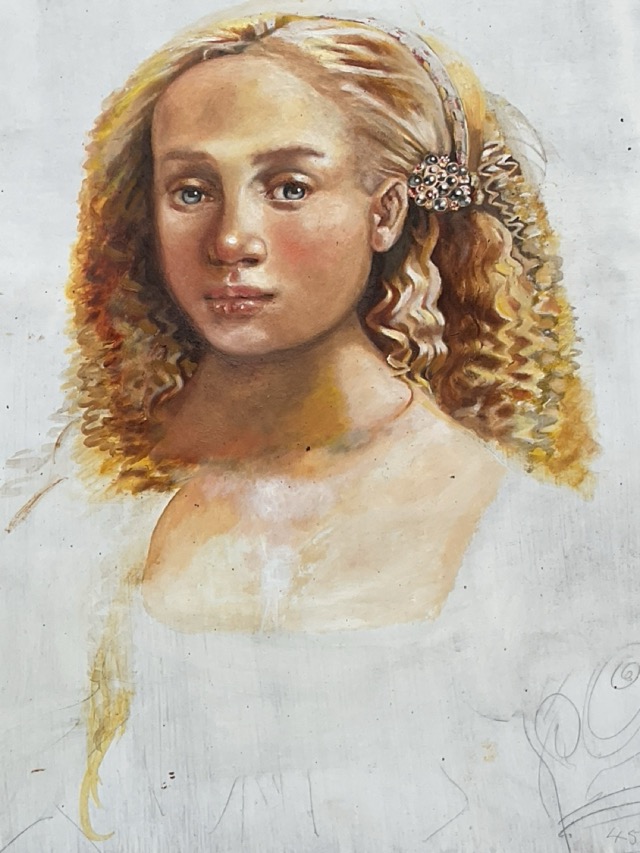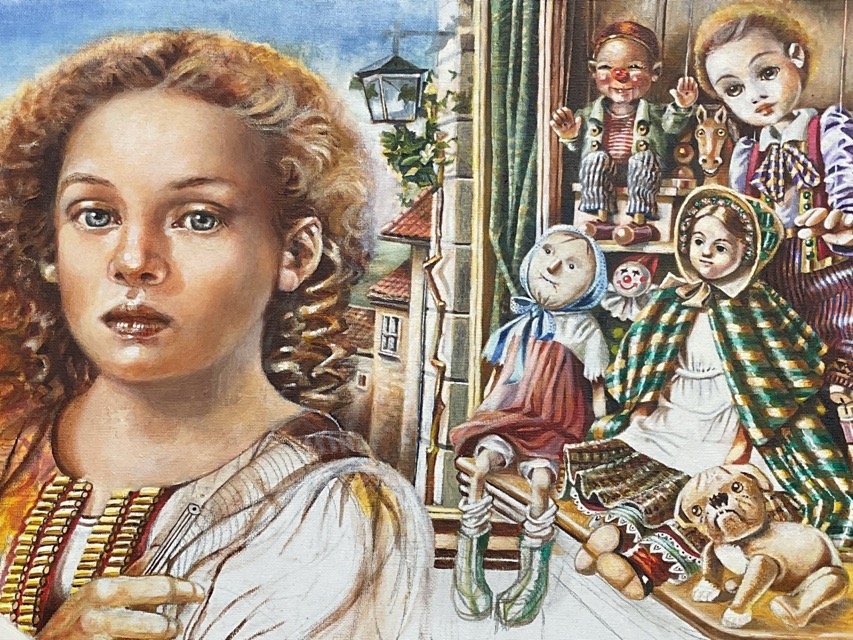 Manuella Norris, oils on board and canvas, a girl with a mask, a girl in renaissance costume, a girl by a window with dolls, and two girls wearing scarves, unsigned. (4)