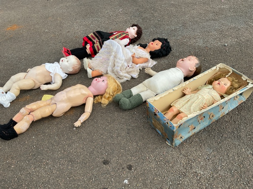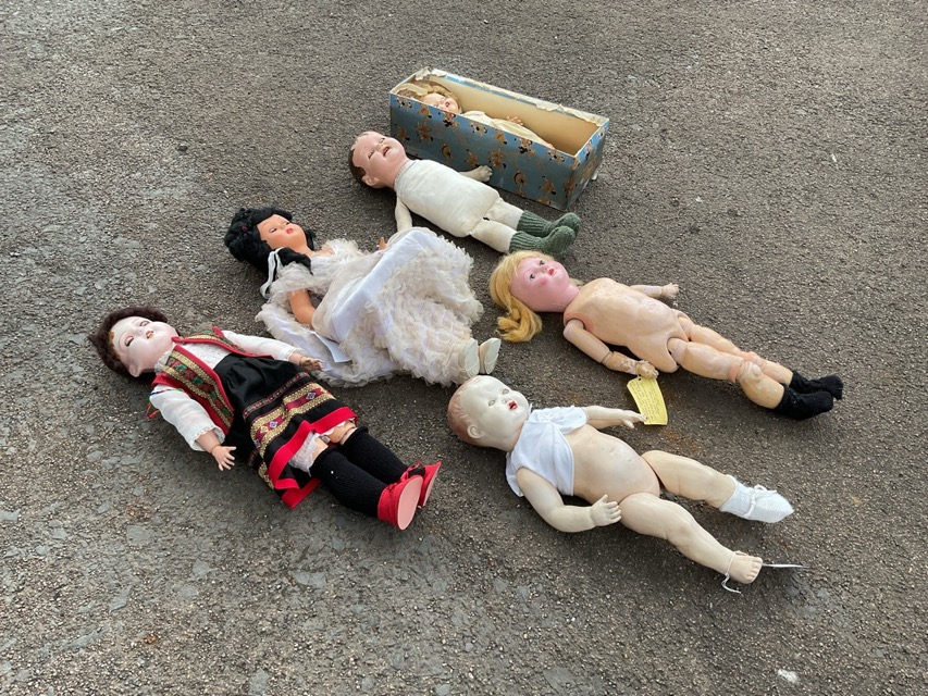 A 20s Belgian composition doll with mohair plaits; a 50s Italian celluloid bride doll by Athena; a 20s boy cloth doll with composition head; a 50s boxed Pedigree Delite doll with original costume; a 40s English plastic baby doll; and an Edwardian composition body with replacement 50s composition head. (6)