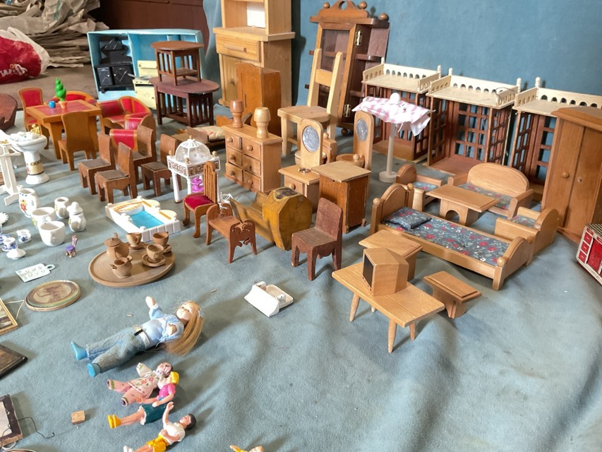 A collection of dolls house furniture and accessories - kitchen stoves, pots & pans, bedroom furniture, chairs, tables, a dresser, a display cabinet, a porcelain bath & basin, miniature ceramics, pictures, figures, etc. (A lot)