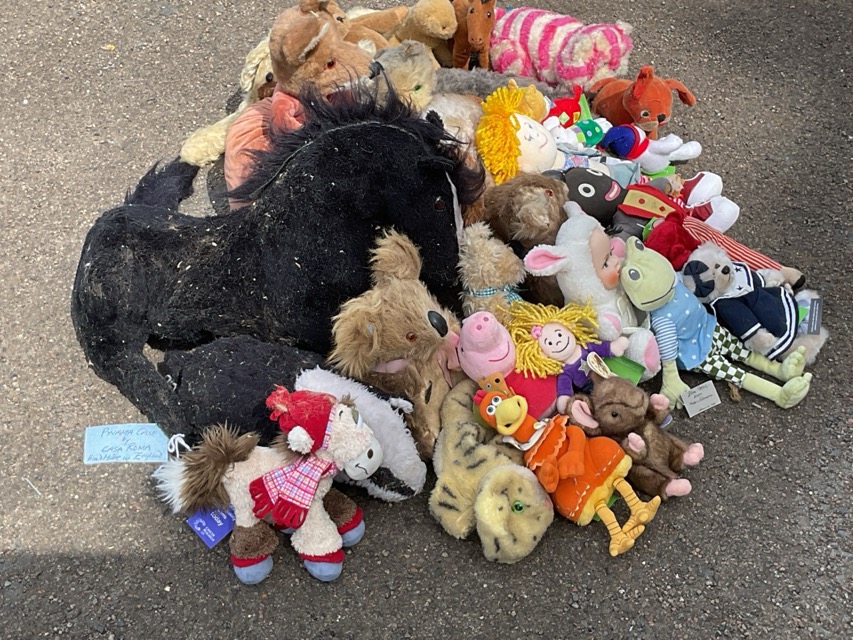 A collection of thirty soft toys and pyjama cases - rag dolls, a golly, Bagpuss, a fox doorstop, bears, horses, rabbits, koalas, dogs, etc. (30)