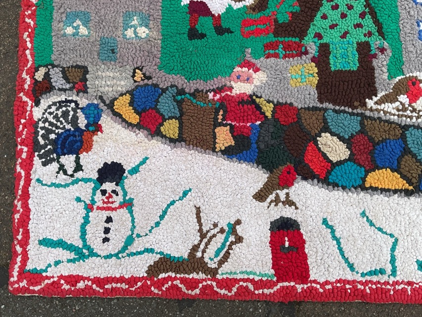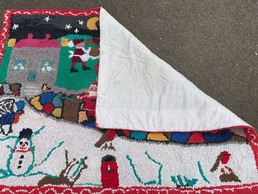 A Christmas themed proggy mat worked in multicoloured fabrics with a winter scene of houses, Santa Claus, robins, a snowman, a turkey, a Christmas tree, etc., with cotton backing. (50in x 38.5in)