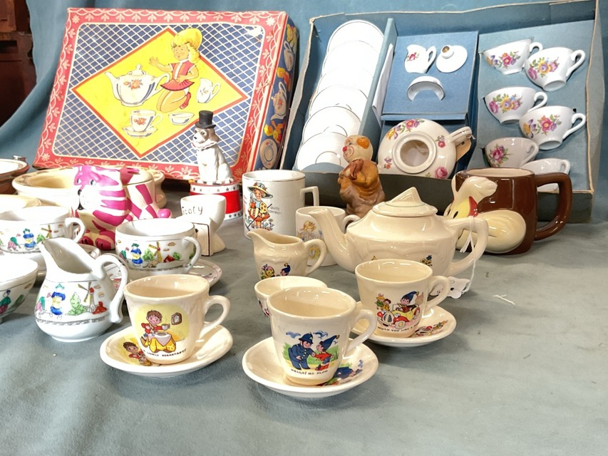 A collection of childrens ceramics - a 50s boxed teaset, a 60s Noddy teaset, a porcelain teaset decorated with dutch scenes, a Bagpuss toothbrush holder, a Sooty eggcup, mugs, babys plates, a Mabel Lucie Atwell warming plate, etc. (A lot)