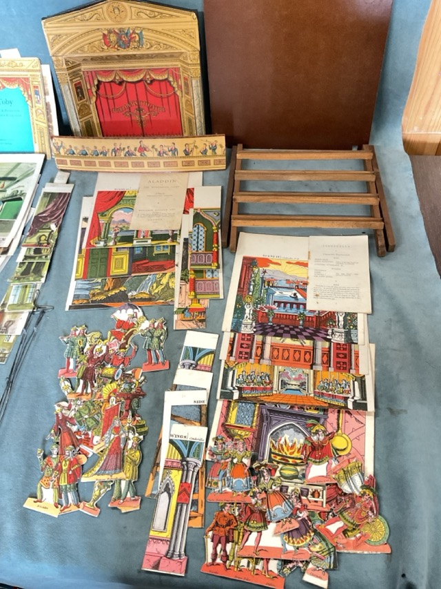 A Pollocks Toy Theatre with scripts and colour printed scenery and characters for Victorian versions of Cinderella and Aladdin, The High Toby by JB Priestley with scenery and characters by Doris Zinkeisen, and handpainted watercolour scenery & characters for The Magic Door. (A lot)