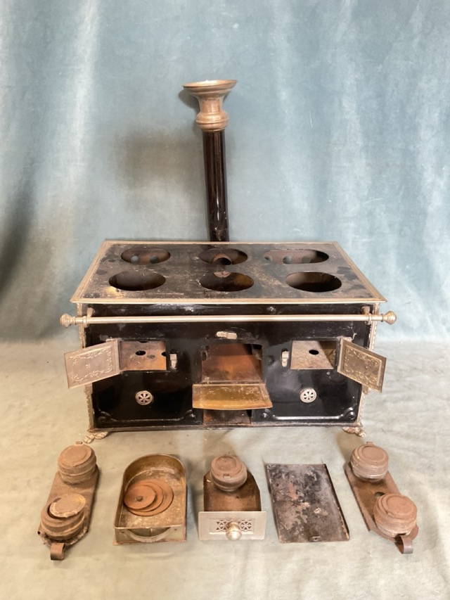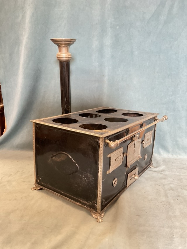A Victorian tinplate kitchen range with chimney above cooking spirit fired rings and tubular steel towel rail, having burner compartments and an oven with burner tray below, raised on winged lions paw feet. (21in x 14.5in x 23.5in)