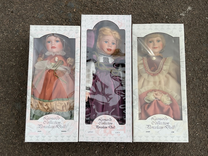 Six boxed Leonardo Collection porcelain dolls all elaborately dressed in Victorian styles - LP1083 Jane, LP2243 Lauren, LP3228 Isabel, LP4270 Susannah, LP3133 Lucy, and LP4499 Lynn. (6)