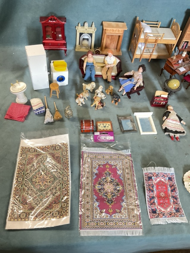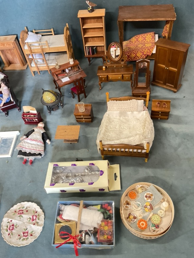 Miscellaneous dolls house furniture and accessories - four-poster and bunk beds, a Victorian style bedroom suite, sofa and armchair, fireplaces, a bureau, chair, a glazed cabinet, woven carpets, mirrors, miniature food, fridge and washing machine, a boxed silver plated tea service, figures, etc. (A lot)