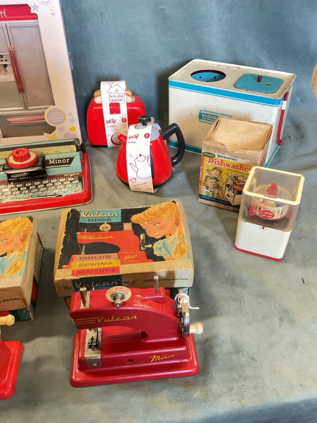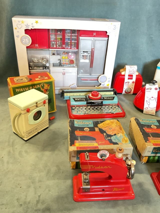 A boxed dolls kitchen set, a toaster & kettle - a Chad Valley Hoover washing machine, a Cadico washing machine, a Mettoy Minor typewriter, a boxed Penguin clockwork dish washer, and boxed Vulcan Minor childrens hand cranked sewing machines. (9)