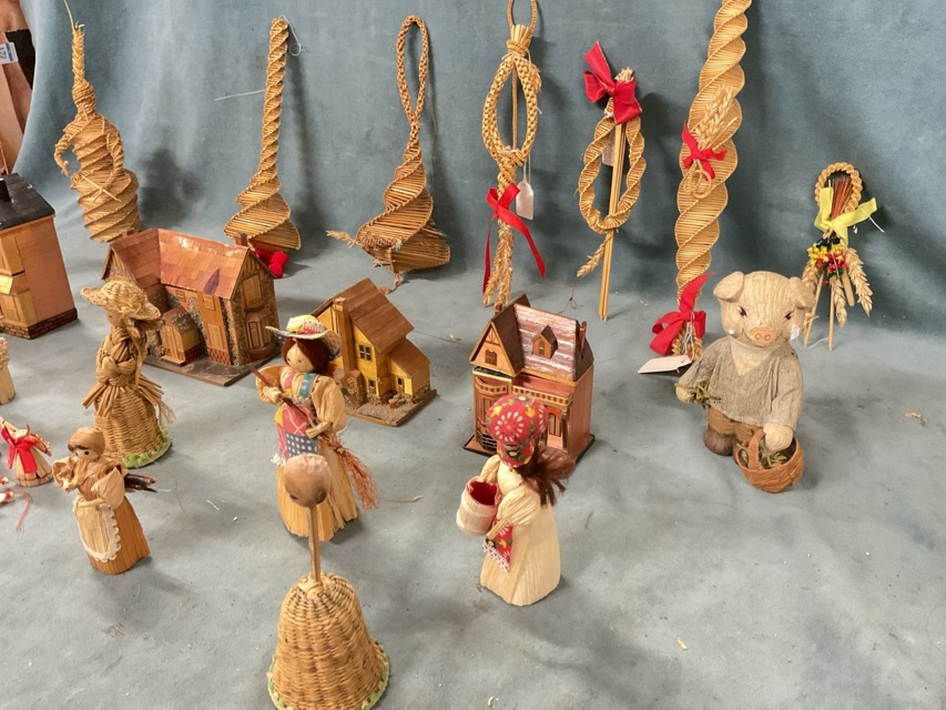 A collection of straw work - corn dollies, model houses, various female figures, a duck, etc. (A lot)
