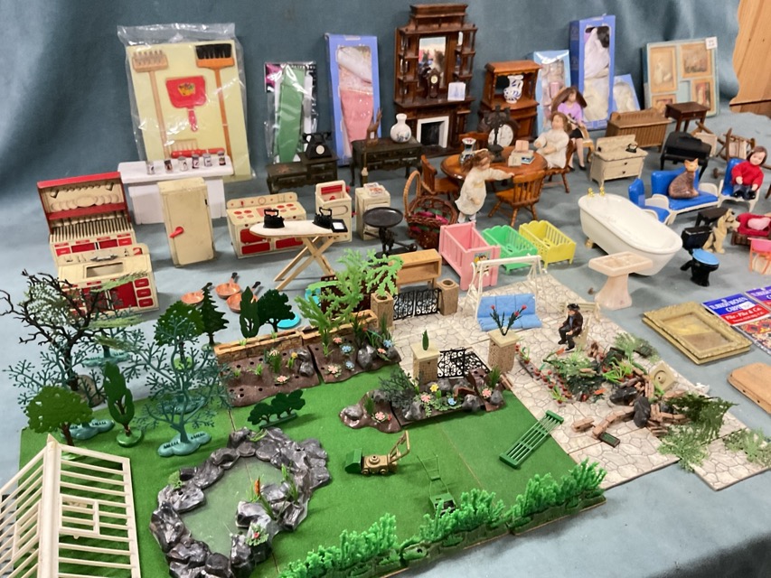 Miscellaneous dolls house furniture and accessories - 50s tinplate kitchen furnishings, a garden with lawns, borders, a pond, a patio, trees, chairs, tables, a fireplace, miniature ceramics, books, ornaments, framed pictures, figures, animals, rugs, etc. (A lot)