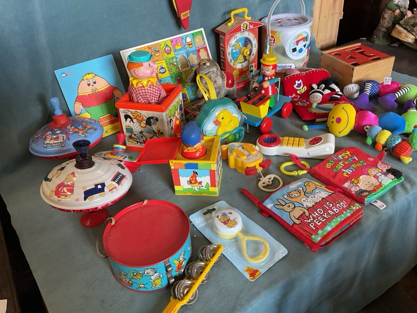 A collection of early years toys - a Merrythought plush parrot on swing, Fisher Price clock, hardwood play blocks, jack-in-the-boxes, humming tops, a tin drum, jigsaws, mechanical bubble blowing elephant, a clockwork elephant on a tricycle, cloth books, etc. (A lot)