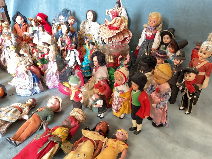 A collection of international costume dolls - Greece, France, Italy, Germany, India, Guadeloupe, Native American, Inuit, Switzerland, Wales, Spain, Netherlands, London, South Africa, Scandinavia, Middle East, etc. (50+)
