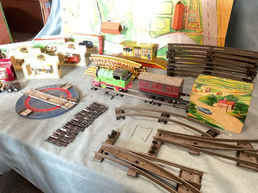 Miscellaneous transport toys - a 50s cardboard pop-up farm diorama with buildings and roads, Mettoy tinplate railway station, tunnel and tracks, Hornby O-gauge tracks, turntable and LMS guards van, a diecast Percy the Saddletank, five boxed delivery vans, a Matchbox truck, etc. (A lot)