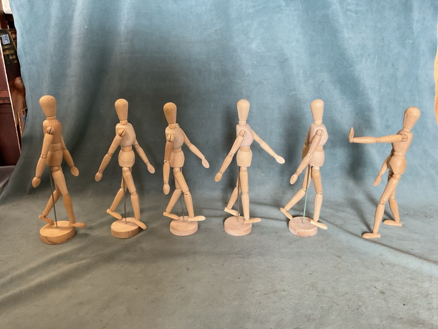 Six hardwood 12in lay figures, five with circular stands, with poseable limbs and articulated bodies. (6)
