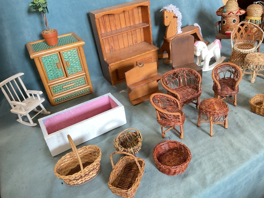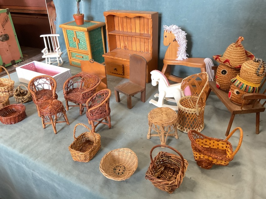 A collection of hardwood and cane dolls furniture and accessories - a dresser and chair, a cabinet with drawer, a pot plant, a rocking chair, rocking horses, cane chairs and tables, a bathtub, shelves, a sofa, miniature cane baskets, a pram, etc. (26)