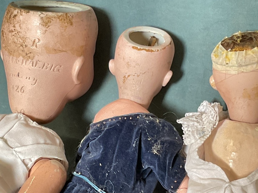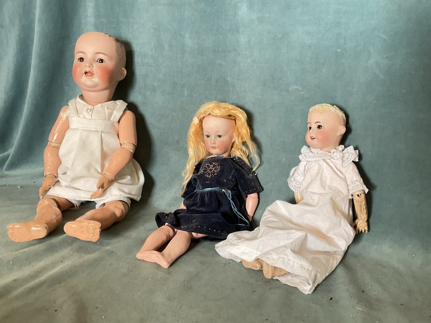 Three antique porcelain head dolls with composition bodies, sleep eyes and articulated limbs - Simon & Halbig 22in with crying box, open mouth and head mould 126, German Revalo 16in with open-closed mouth, mohair wig and original dress, and French SPBJ 16in with open mouth. (3)