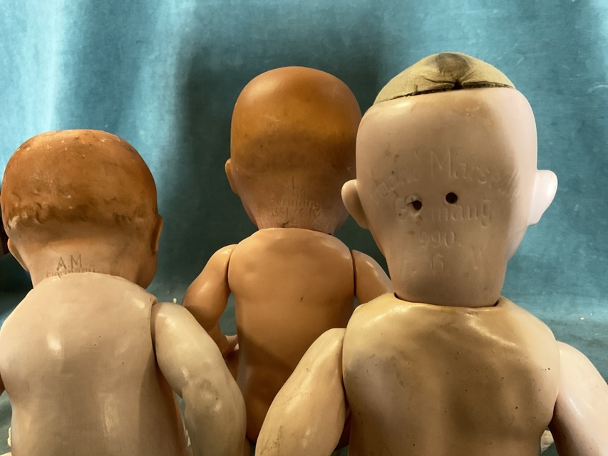 Three Armand Marseille bisque headed baby dolls with sleep glass eyes, open mouths, composition bodies and jointed limbs, head mould numbers 352, 351 and 990. (3)