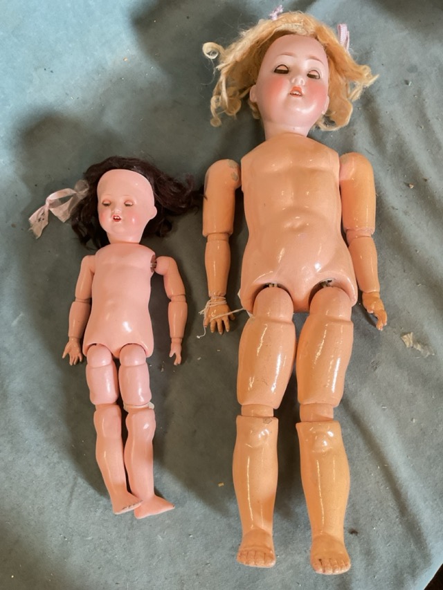 A French 15in bisque head doll probably SFBJ, and a 23in Armand Marseille, with mohair wigs, composition bodies and articulated limbs; a 50s composition 18in black toddler doll with sleep eyes and jointed limbs; and a 50s Pedigree 21in plastic walking black doll with mama box. (4)