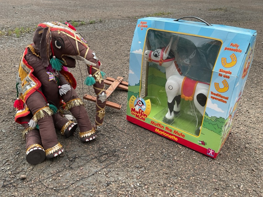 Miscellaneous puppets - an eastern handpainted Wajang, Punch & Judy with wood hands & faces, stick puppets, an indian elephant, a Muffin the Mule marionette, wire puppets, a handmade Mexican dance of the flyers, etc. (40)