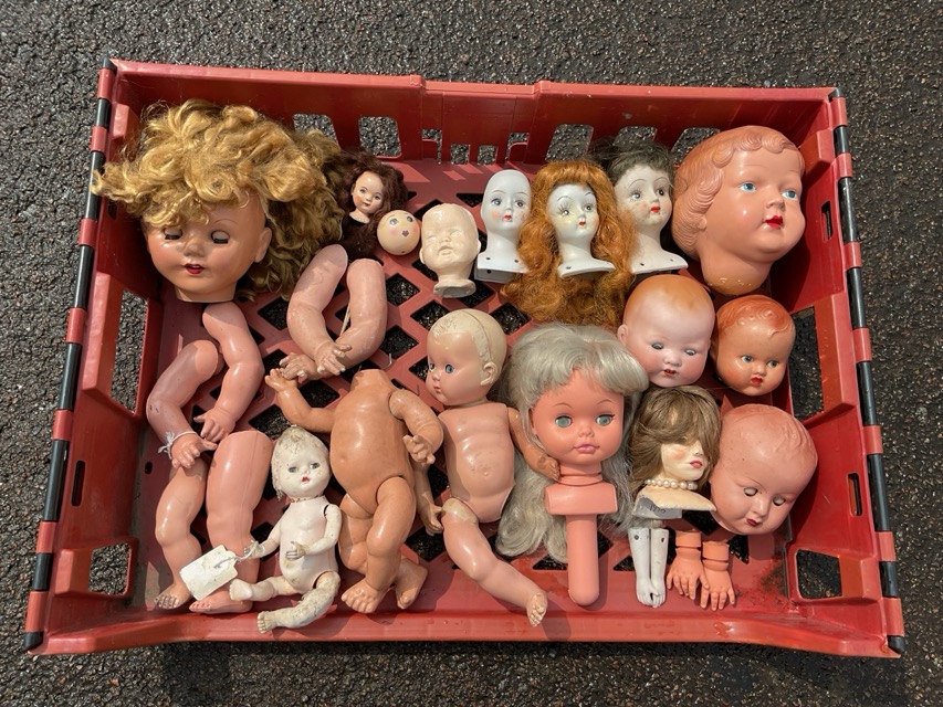 Miscellaneous doll parts - porcelain, composition, vinyl, heads, legs, hands, wigs, cloth bodies, jointed limbs, glass eyes, etc. (A lot)