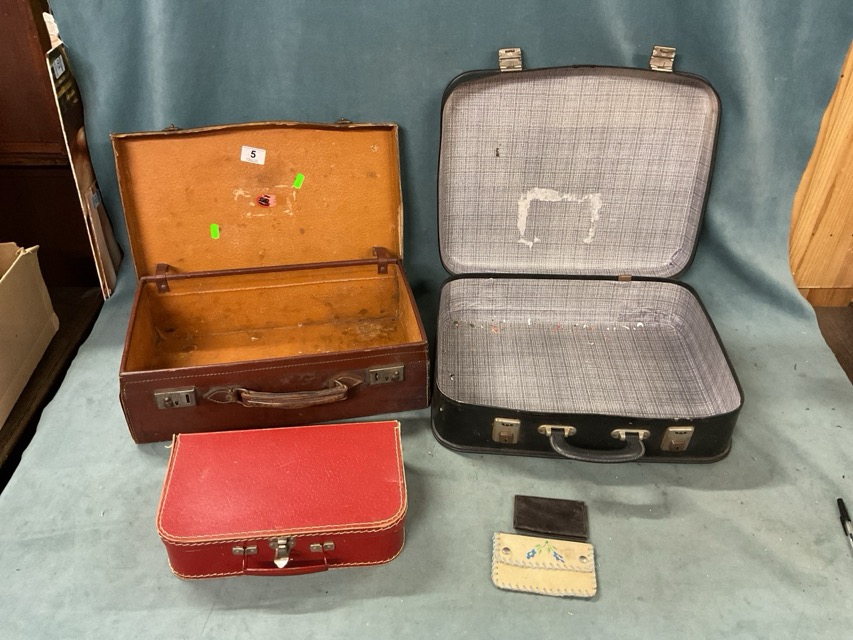 A collection of leather childrens satchels & suitcases - bags with shoulder straps, a hand-tooled case, wallets, a Crowns suitcase, a dolls case, etc. (8)