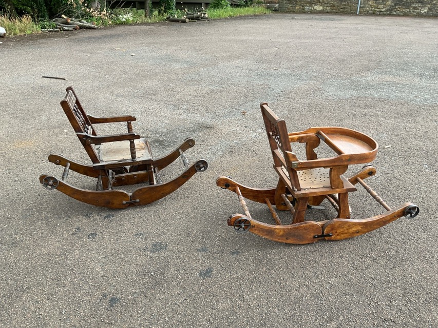 An Edwardian metamorphic high cair with spindled back and solid seat on turned supports, raised on sabre legs with cast iron wheels - converting to a curved rocker; and another similar with semicircular hinged tray. (2)