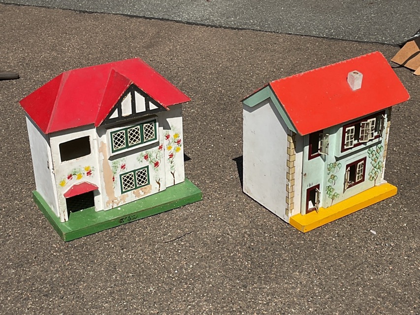 A 50s painted wood dolls house with hipped roof, metal windows and three rooms; another similar with pitched roof and two rooms; and a scratch-built wood building with shelved kitchen, balustraded mezzanine, pitched roof, etc. (3)