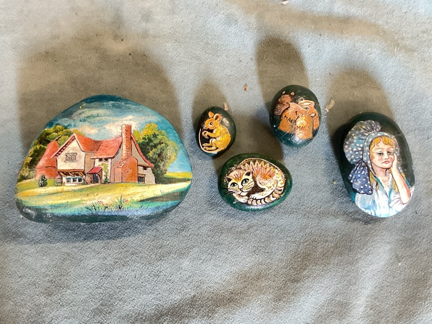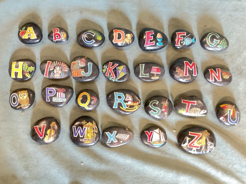 Norris Walker, painted pebble alphabet - each letter with an appropriate object depicted beside it, and five further painted pebbles depicting a farmhouse, a cat, a mouse, sacks of malt, and a girl. (31)
