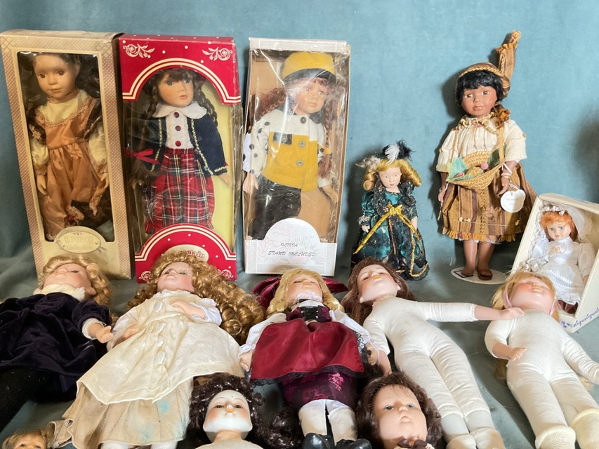 A collection of porcelain dolls - three boxed girl dolls, a boxed bride doll, boys and girls dressed dolls, and three undressed examples. (12)
