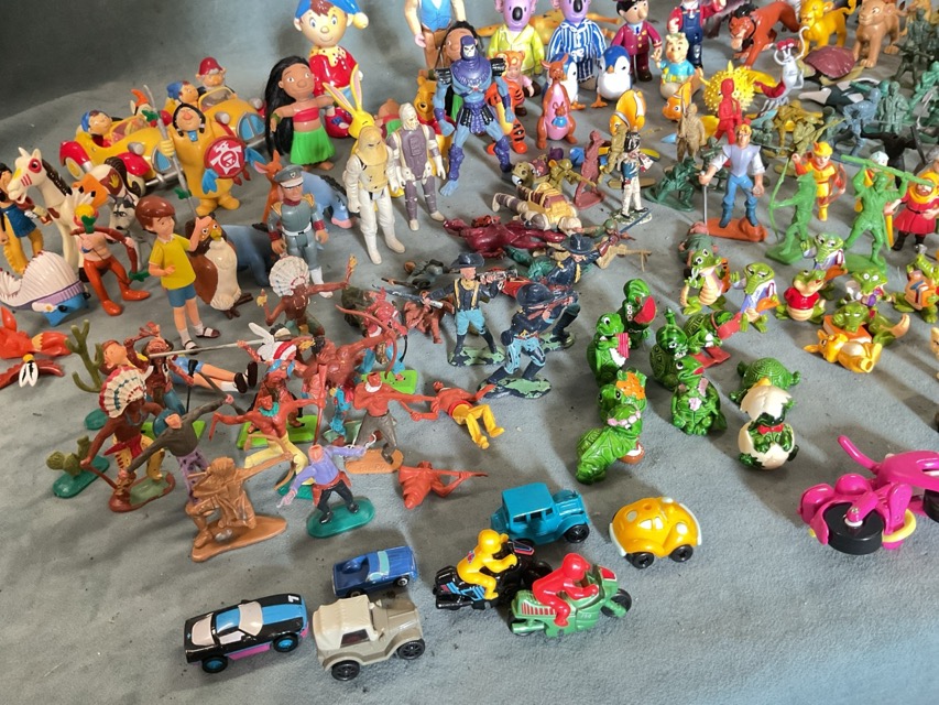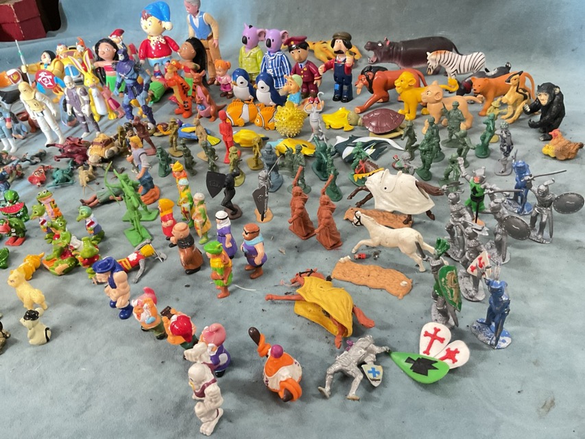 A collection of small plastic figurines - Winnie-the-Pooh, Finding Nemo, the Lion King, Pocahontas, Lilo & Stitch, Postman Pat, Noddy, cowboys & indians, medieval knights, soldiers, animals, etc. (A lot)