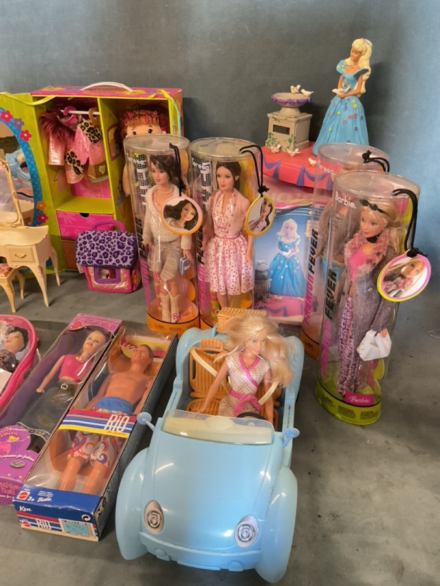 A collection of Barbie and other fashion dolls & accessories - boxed Fashion Fever dolls, a VW car & Barbie, Rio de Janeiro Kem, a boxed talking clock, a Sindy doll with bedroom suite, a Singapore Airlines Kristie doll and accessories, a Groovy Girls doll & wardrobe, etc. (16)