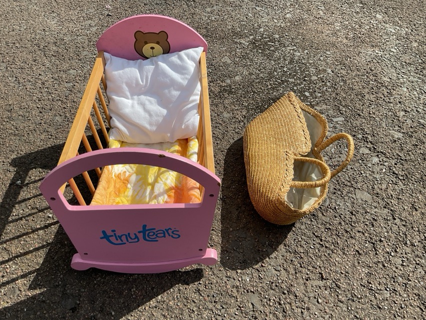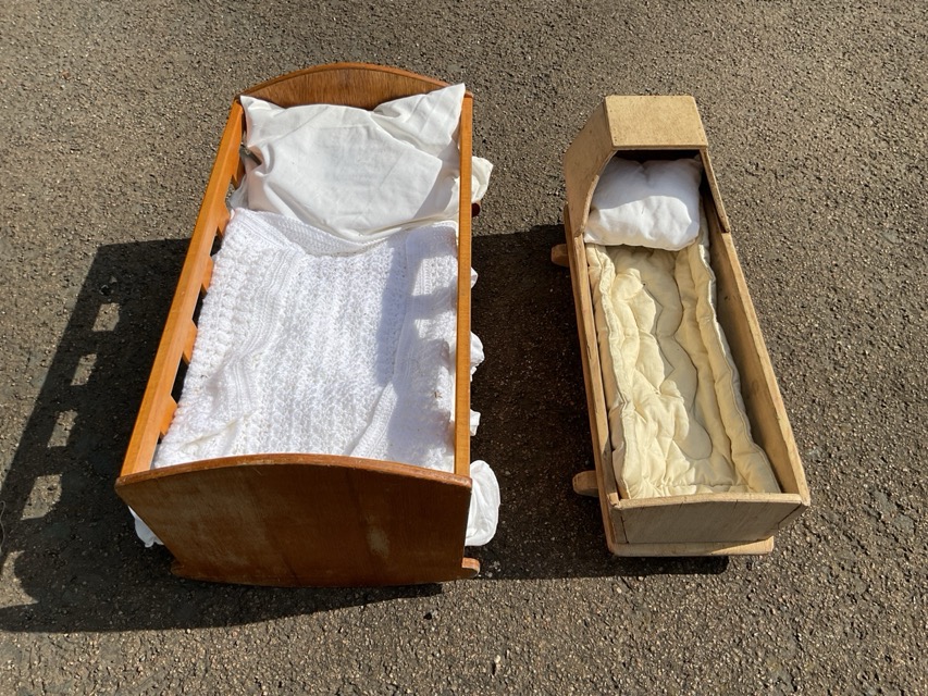 Four dolls cradles: a beech with curved headboard on rockers, having mattress, pillow and blankets; pine plank construction with pitched hood; a Tiny Tears pink with slatted bars on sides; and a woven raffia carrier with handles. (4)