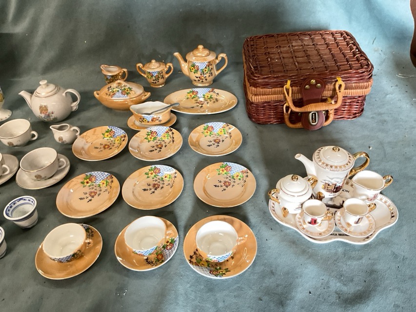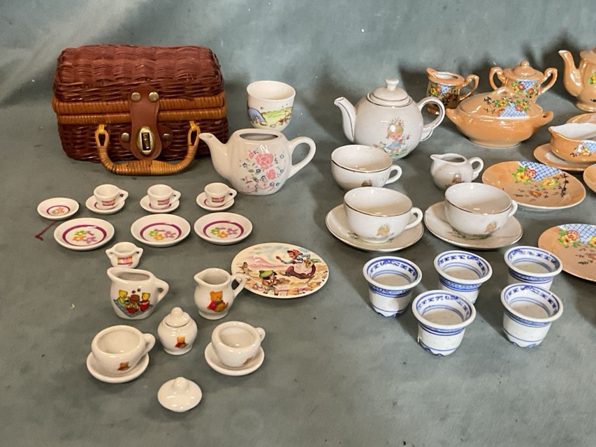 A collection of dolls ceramics - a Japanese porcelain set decorated with flowers, a 50s teaset decorated with a little girl and her cat, Chinese blue & white beakers, a cane hamper containing Barbie and teddy bear tea services, a hamper containing a coffee service and tray, etc. (A lot)
