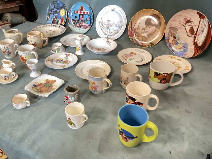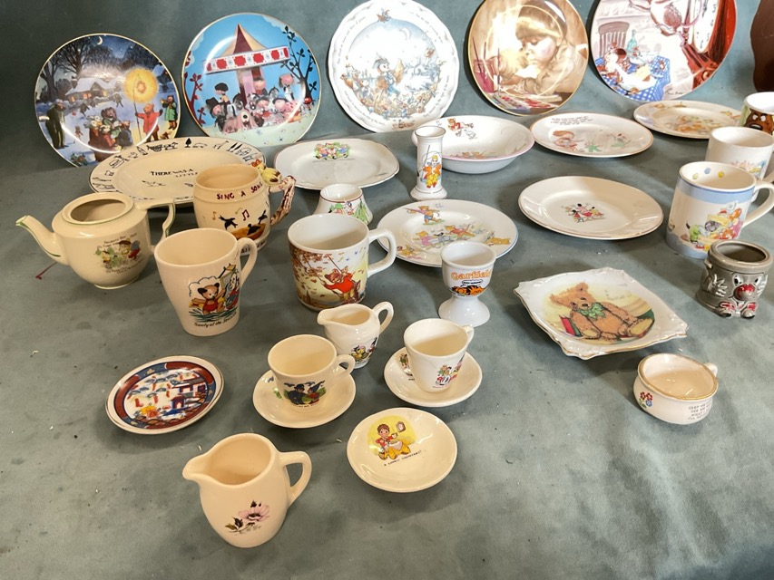 Miscellaneous childrens ceramics - plates and bowls with animal characters, a 50s Noddy part teaset, mugs featuring Scooby-Doo, Rupert,Goofy, Dennis-the-Menace, Magic Roundabout, Sooty & Sweep, Wedgwood, Aynsley, Royal Doulton, Shelley, etc. (A lot)