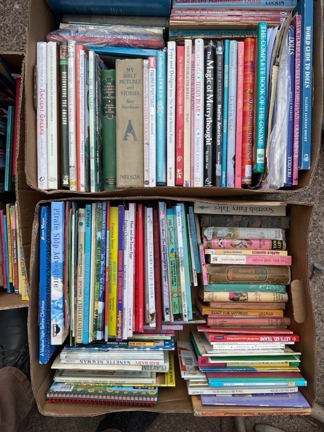 Three boxes of childrens books - doll & teddy bear collecting, toy crafting, educational, fairies & fairytales, novels and illustrated story books, Christmas stories, etc. (166)