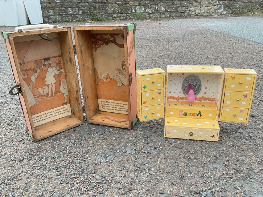 Miscellaneous dolls furniture - rocking chairs, a wooden bench, cabinet, a Tiny Tears wardrobe with drawers & hangers, a musical armoire, chests, woven baskets, a sledge, chairs, etc. (14)