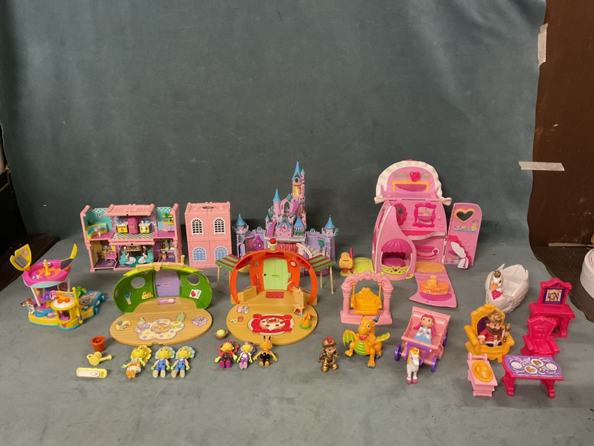 A collection of modern toys including a Boxed Fireman Sam fire station, a Disney castle, a model farmhouse, animals, accessories and cottage, a Polly Pocket modular house, Fifi and the Flowerpots, a modular space station and astronauts, clip-together dolls furniture, etc. (A lot)