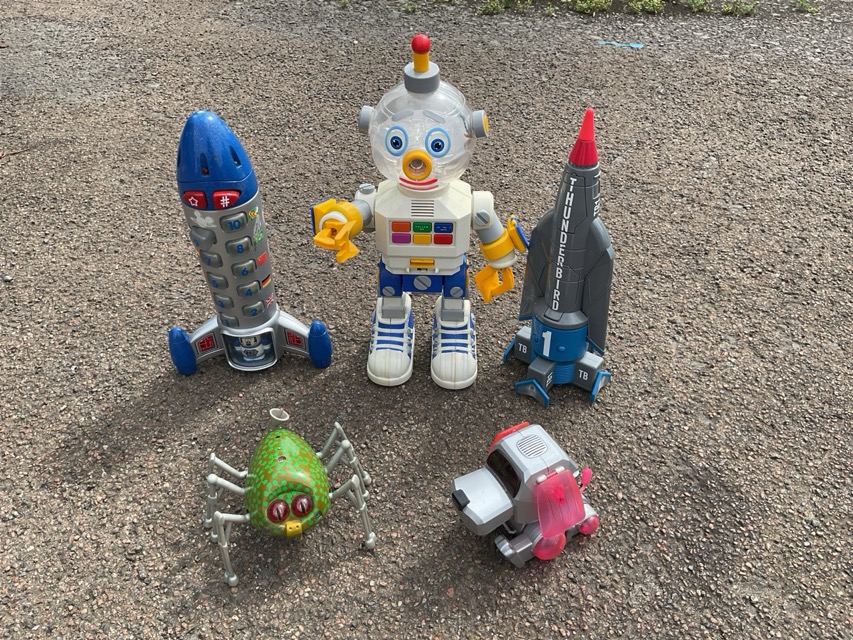 Miscellaneous battery operated toys - a boxed remote control go-kart, a speedboat by Platwell, a My Pal 2 talking robot, a Poo-Chi robotic dog by Sega, cars, A Vtech laptop & interactive classroom, a Star Wars pinball, clocks, Thomas the Tank Engine, a insecto bot by MGA entertainment, Rubiks cubes, gimmick toys, a water pistol, a Thunderbirds rocket ship, videos, etc. (35)