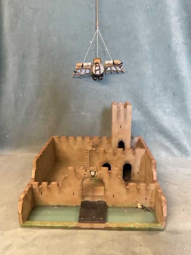 A collection of wood toys - a castle with bridge, a rabbit & elephant, building blocks, handmade articulated crocodile and snakes, soldiers, pull toys, money boxes, dioramas, a figure with wings and hanging wire, etc. (a lot)