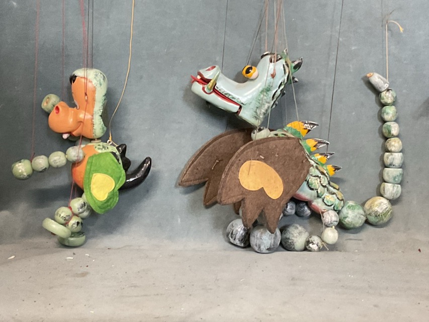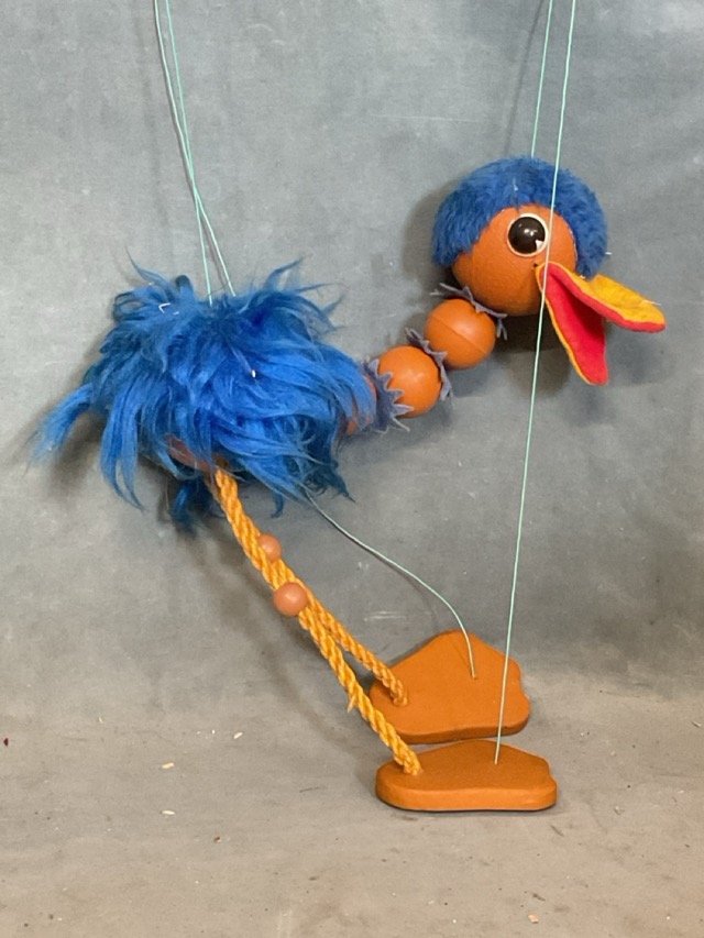 Three Pelham marionette puppets - Baby Dragon, Mother Dragon, and Rod Hulls Emu. (3)