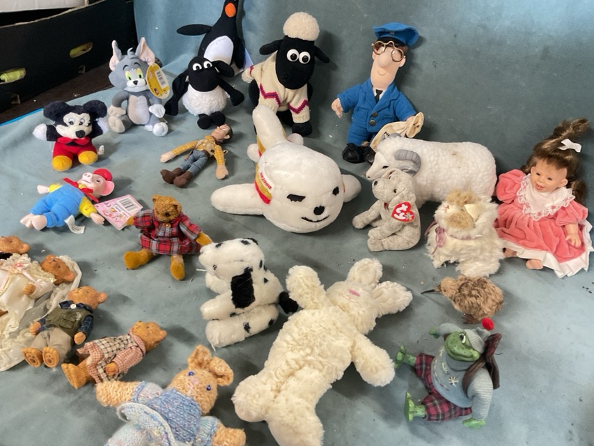 A collection of soft toys and jointed bear dolls - Wallace & Gromit figures of Feathers McGraw and Shaun the Sheep, Postman Pat, Mickey Mouse, Tom the cat, Woody from Toy Story, Perky the pig, miscellaneous cats, dogs, rabbits, etc. (23)
