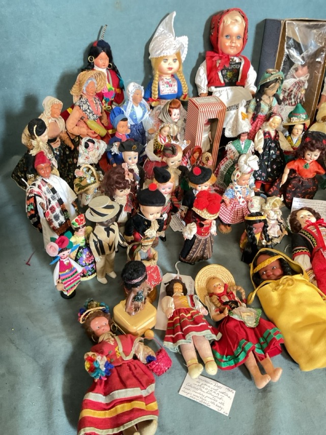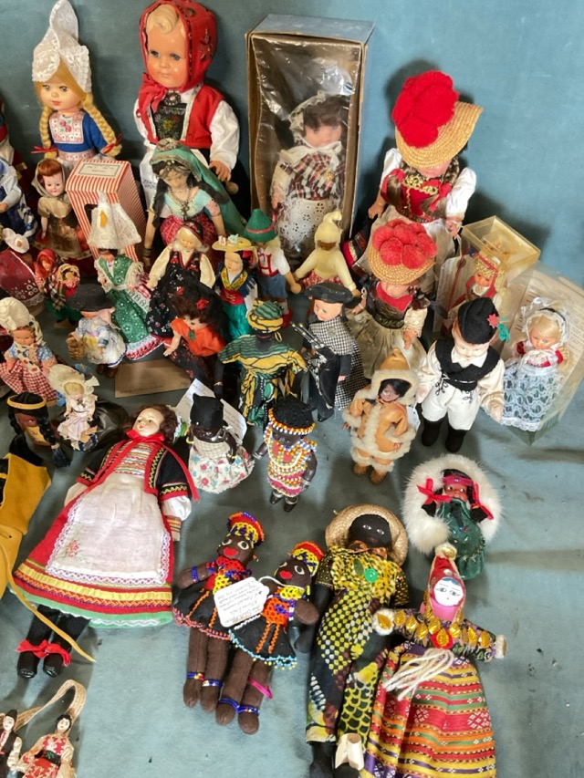 A collection of 30s and later costume dolls - Native American, Scotland, Wales, Ireland, Nigeria, French provinces, India, Portugal, Spain, Inuit, South Africa, Norway, Denmark, Germany, Turkey, Maori, etc. (64)