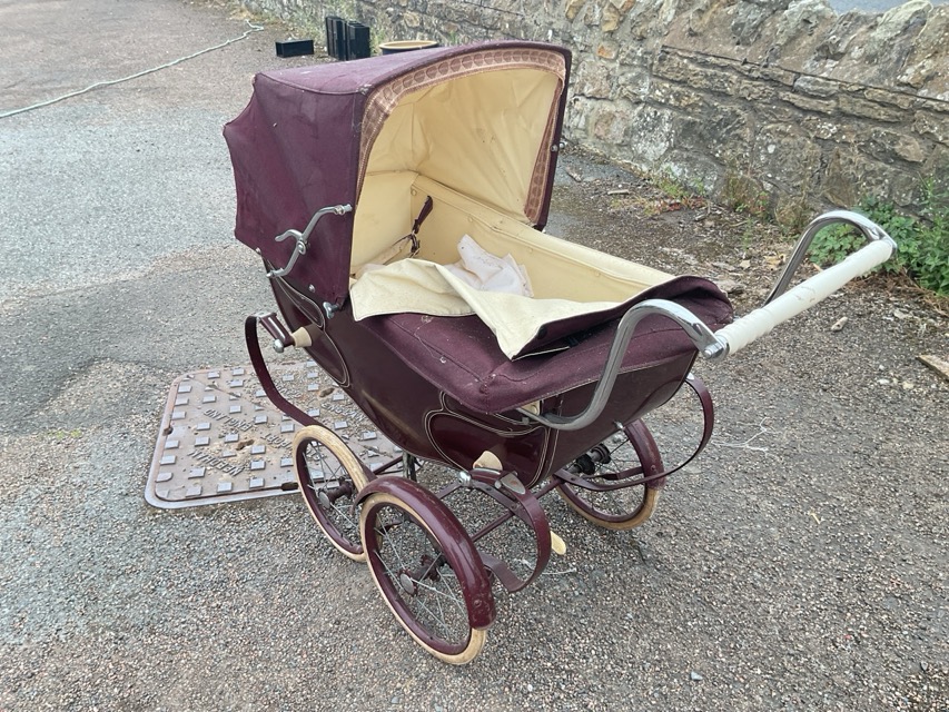 A Silver Cross burgundy coloured pram retailed by A Taylor & Co, having canvas canopy & embellished opening, with padded upholstered interior. (36in)