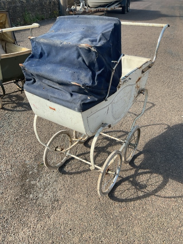 A Victorian style dolls pram with lined interior and concertina canopy, the green enamelled tub shaped body having leather strap suspension; and a Tri-ang pram of serpentine form, with lined interior, raised on chromed wheels. (2)