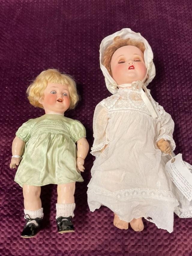 A 20s Heubach porcelain head model 342.2 walking doll with sleep eyes, open mouth, composition body and jointed limbs; and another similar model 320.5 doll. (2)