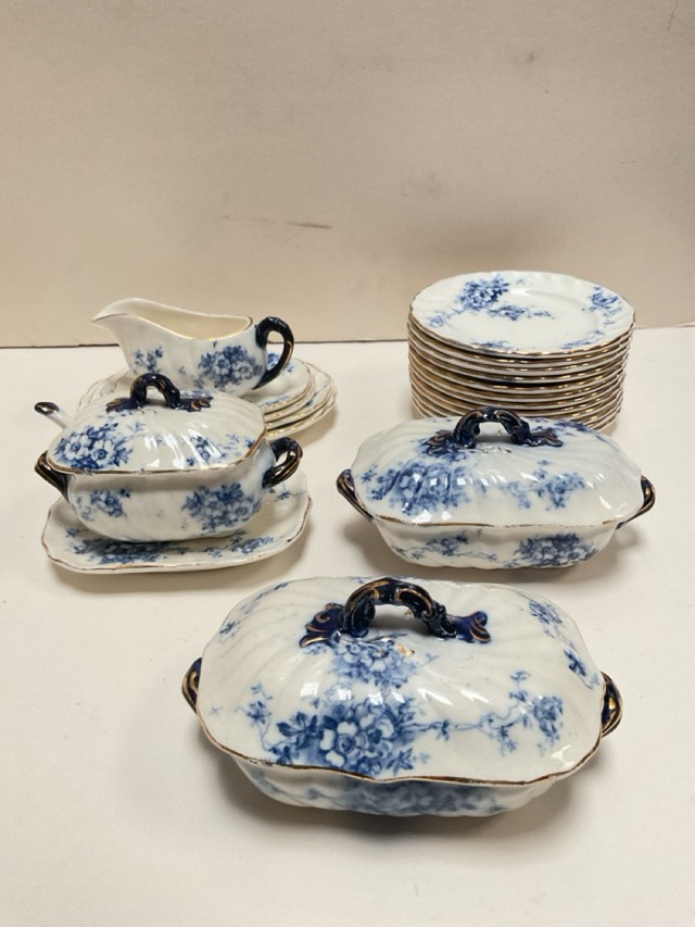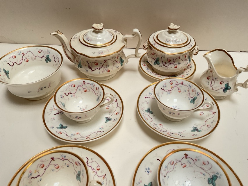 A C19th childs teaset handpainted with strawberries & floral sprigs, having gilt edges; and a childs twelve-piece blue & white dinner service by Rosamund. (2)